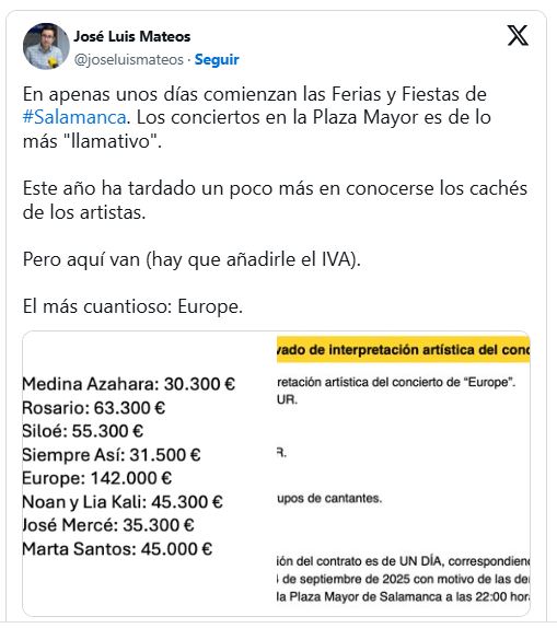 Así lo señala en su perfil de la red social X el portavoz del grupo municipal socialista, José Luis Mateos, que ha difundido el precio de cada concierto del programa, y apunta que a cada cifra habría que agregarle el IVA.