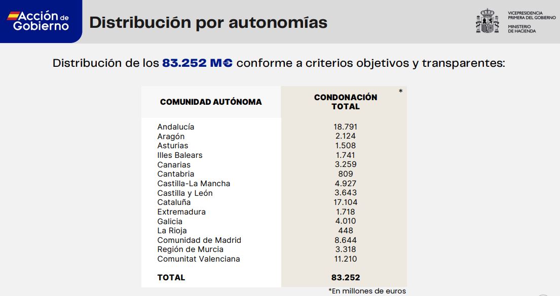Para rebatir las críticas, la ministra Montero ha subrayado que la medida es para todas las regiones del régimen común y que, de hecho, 60.000 millones de euros del total corresponden a comunidades gobernadas por el PP. Las regiones más beneficiadas en cifras absolutas serán Andalucía, con una quita de 18.791 millones, y Cataluña, con 17.104 millones. Juntas suman más del 43% del total. El País Vasco y Navarra no se ven afectadas al tener un sistema de financiación propio.