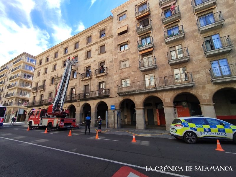 Los Bomberos desplegaron la escala para actuar entre las tercera y cuarta planta del inmueble, mientras la Policía Local regulaba el tráfico, al cortarse parcialmente la calle para que pudieran intervenir los servicios de emergencia.
