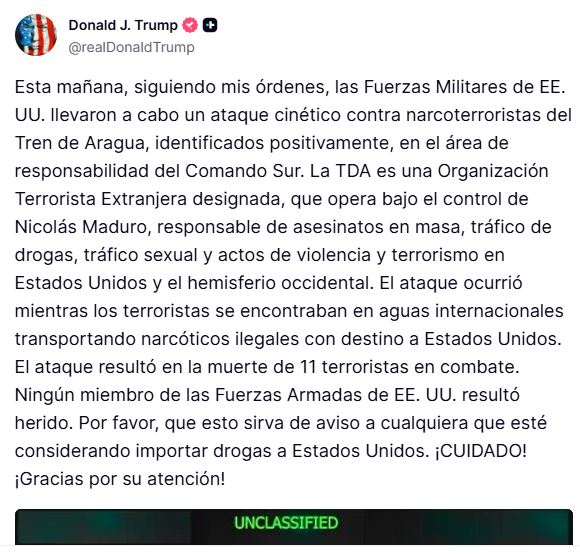 El presidente de Estados Unidos, Donald Trump, ha confirmado que sus Fuerzas Armadas han destruido un barco en aguas internacionales, causando la muerte de 11 personas. Según Washington, la embarcación transportaba drogas desde Venezuela y sus tripulantes eran «narcoterroristas» de la banda Tren de Aragua. Se trata de una acción militar sin precedentes y la primera vez que EEUU utiliza fuerza letal en un operativo de este tipo.
