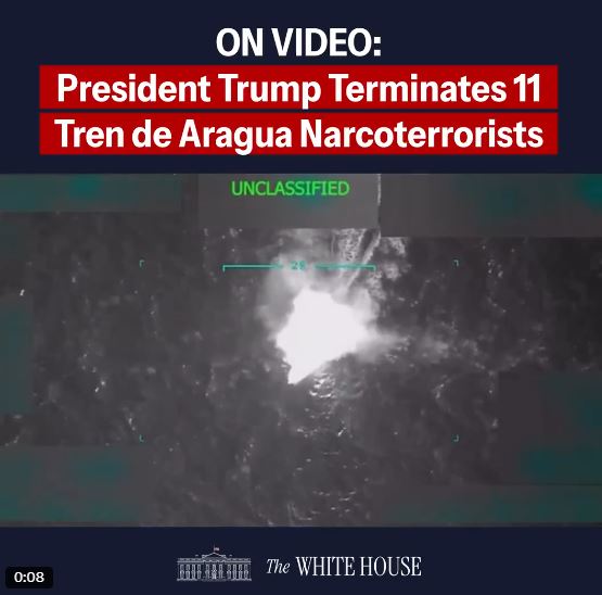 ?? ON VIDEO: U.S. Military Forces conducted a strike against Tren de Aragua Narcoterrorists. The strike occurred while the terrorists were at sea in International waters transporting illegal narcotics, heading to the U.S. The strike resulted in 11 terrorists killed in action. pic.twitter.com/iszHE0ttxQ