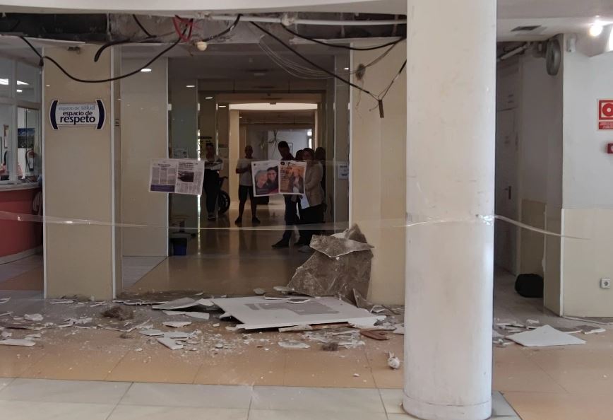 Necesita la Junta que haya algún muerto para que se pongan las pilas y arregle de una vez y en buenas condiciones este centro construido con materiales baratos? Ha habido mucha suerte de que no cayera encima de nadie a la hora que ha sido, porque es una zona de paso a la entrada y en la que se forman colas para pedir citas y otras gestiones. Vaya gestión tan nefasta de los responsables.