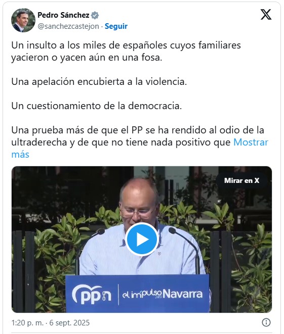 La respuesta del presidente del Gobierno llegó a través de su perfil en la red social X. Sánchez afirmó que la expresión de Tellado es un «insulto» para los miles de españoles «cuyos familiares yacieron o yacen aún en una fosa». Además, calificó las declaraciones de «apelación encubierta a la violencia» y «un cuestionamiento de la democracia». Para el presidente, este episodio es «una prueba más de que el PP se ha rendido al odio de la ultraderecha».