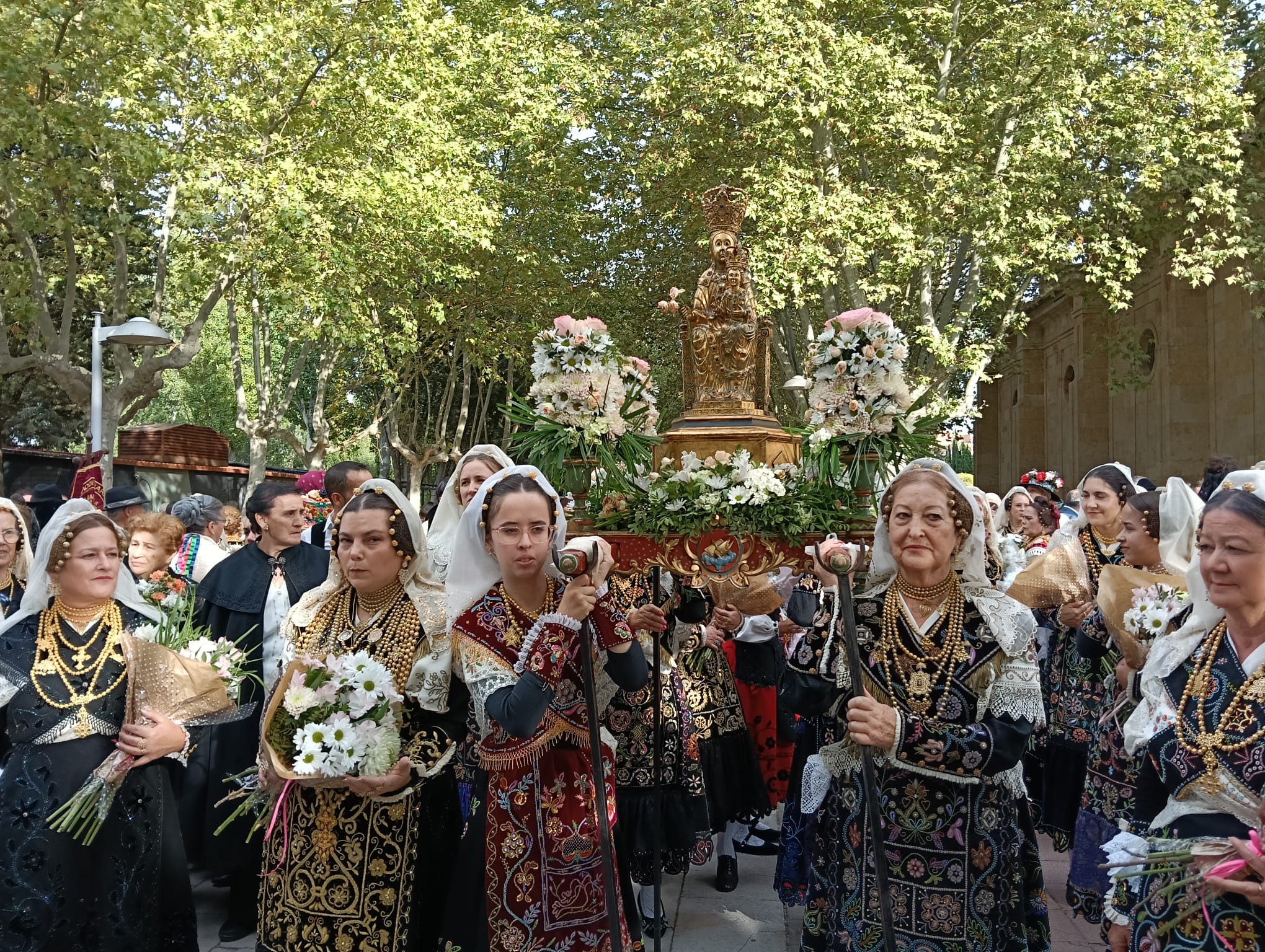 Engalanadas con los trajes de charras y luciendo sus mejores alhajas, las mujeres de la asociación del Traje Charro portan en andas a la Virgen de la Vega y las ofrendas de flores, mientras los hombres tocan la gaita y el tamboril.