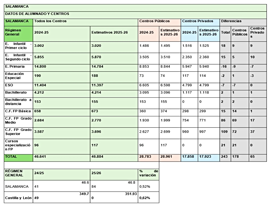 En la provincia de Salamanca, la estimación para este curso es de 46.884 alumnos del régimen general, lo que supone un incremento del 0,52 % respecto al curso pasado. En toda la comunidad la estimación alcanza los 351.930 estudiantes, según confirman desde la Junta.