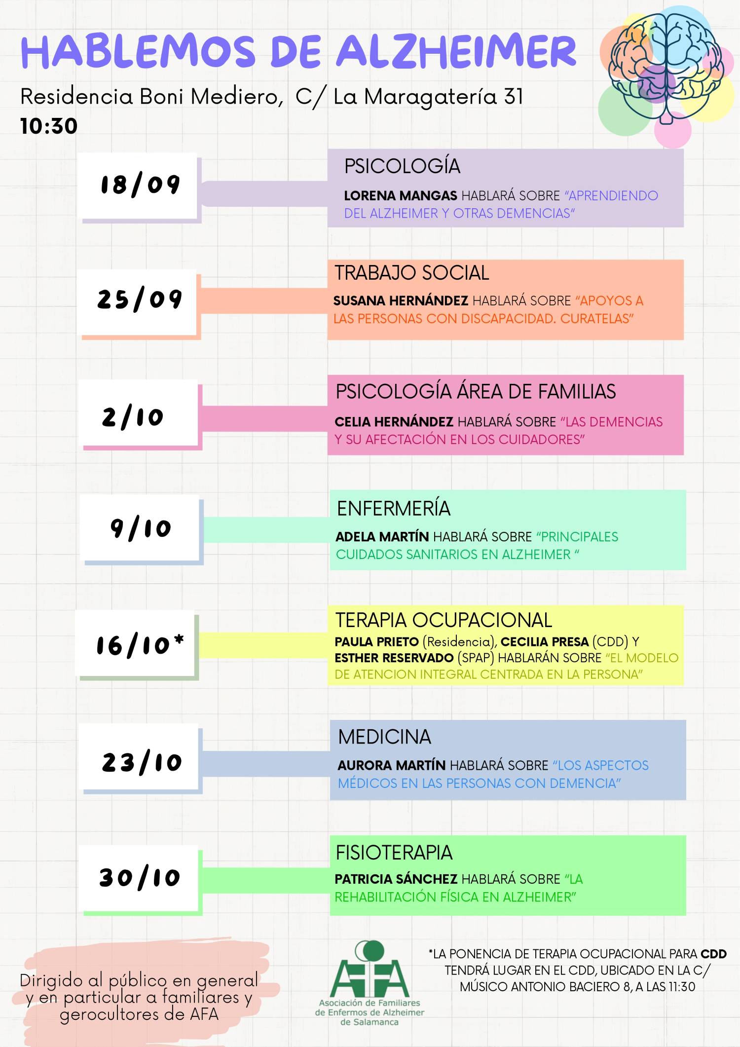 - ‘Hablemos de Alzheimer’: 18 de septiembre, a las 10:30, inauguración de dicho programa psicoeducativo en su centro residencial. Incluye varias propuestas para septiembre y octubre.