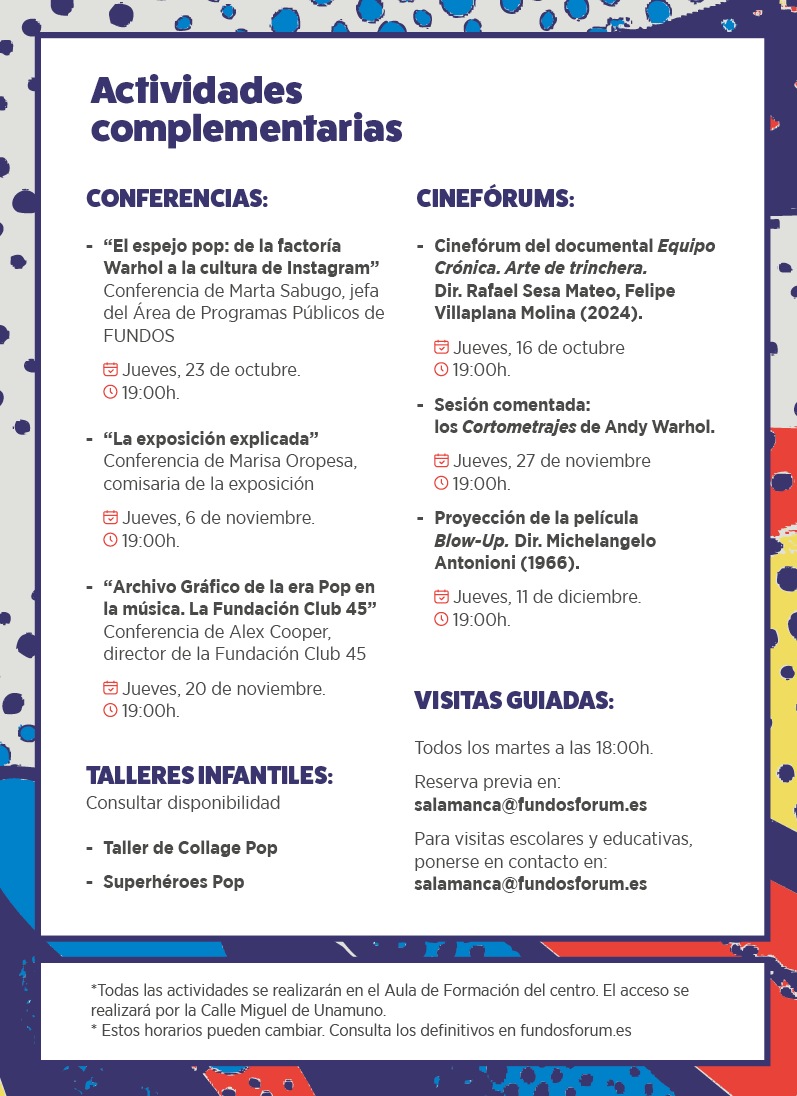El centro cultural acogerá a partir del día 16 actividades culturales relacionadas con la muestra, entre ellas, tres conferencias y tres cinefórums. Además, todos los martes a las 18:00 horas, se realizará una visita guiada bajo reserva a través del e-mail salamanca@fundosforum.es.