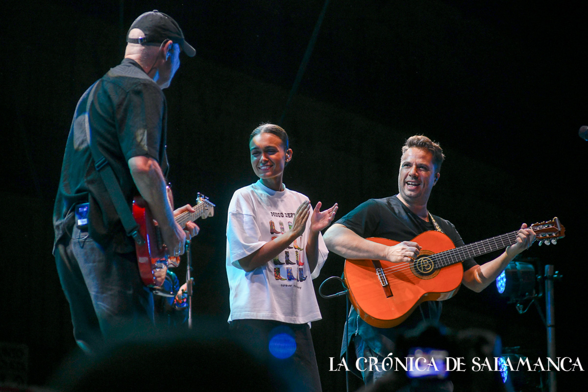 Marta Santos sacó el duende que lleva dentro e hizo que la Plaza Mayor bailara y coreara sus canciones. Una puesta en escena sencilla. Lució camiseta blanca estampada con botas de cowboy y pantalón negro. Y un saludo directo: «Buenas noches, Salamanca. ¿Cómo estáis? Yo súper contenta y muy feliz de estar aquí con todos vosotros. Espero que disfrutéis, como lo vamos a hacer nosotros». Así se presentó a su público.