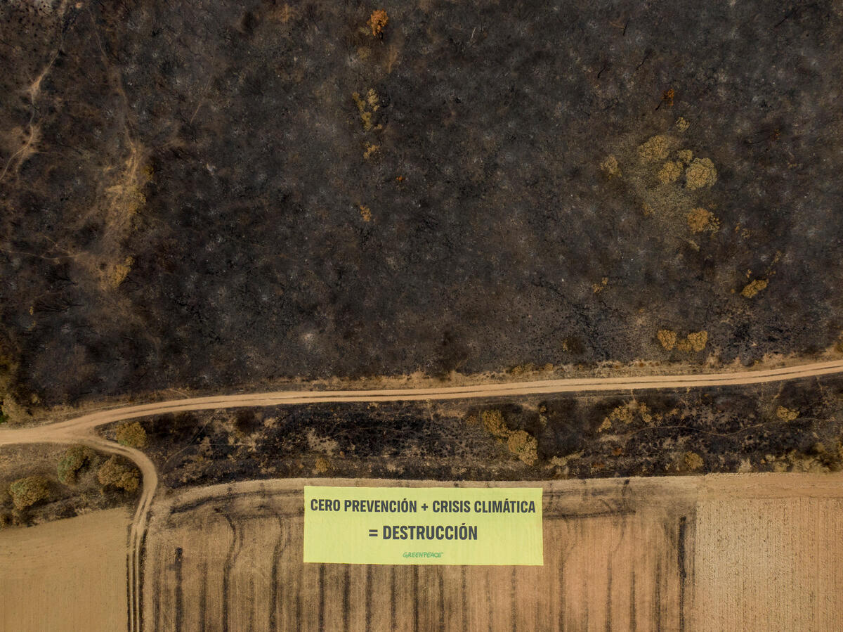 Con esta imagen, Greenpeace reclama la necesidad de que las zonas afectadas no caigan en el olvido y que 2025 marque un verdadero punto de inflexión en la puesta en marcha de políticas eficaces de prevención frente a incendios de alta intensidad.