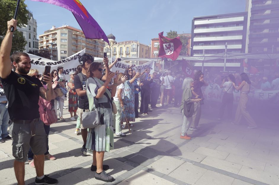 Al terminar la lectura del manifiesto, los trabajadores del servicio de extinción de incendios, golpearon repetidas veces el suelo con sus batefuegos, como si extinguieran el fuego representado por el humo de color púrpura de una bengala.