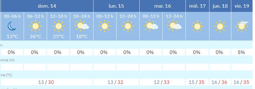 Desde el lunes hasta el viernes, las mínimas oscilarán entre los 13º y los 16º, lo que permitirá que se duerma sin el agobio de las noches tórridas del verano. Eso sí, el termómetro sube hasta los 36º el jueves y el miércoles y viernes se eleva hasta los 35º.