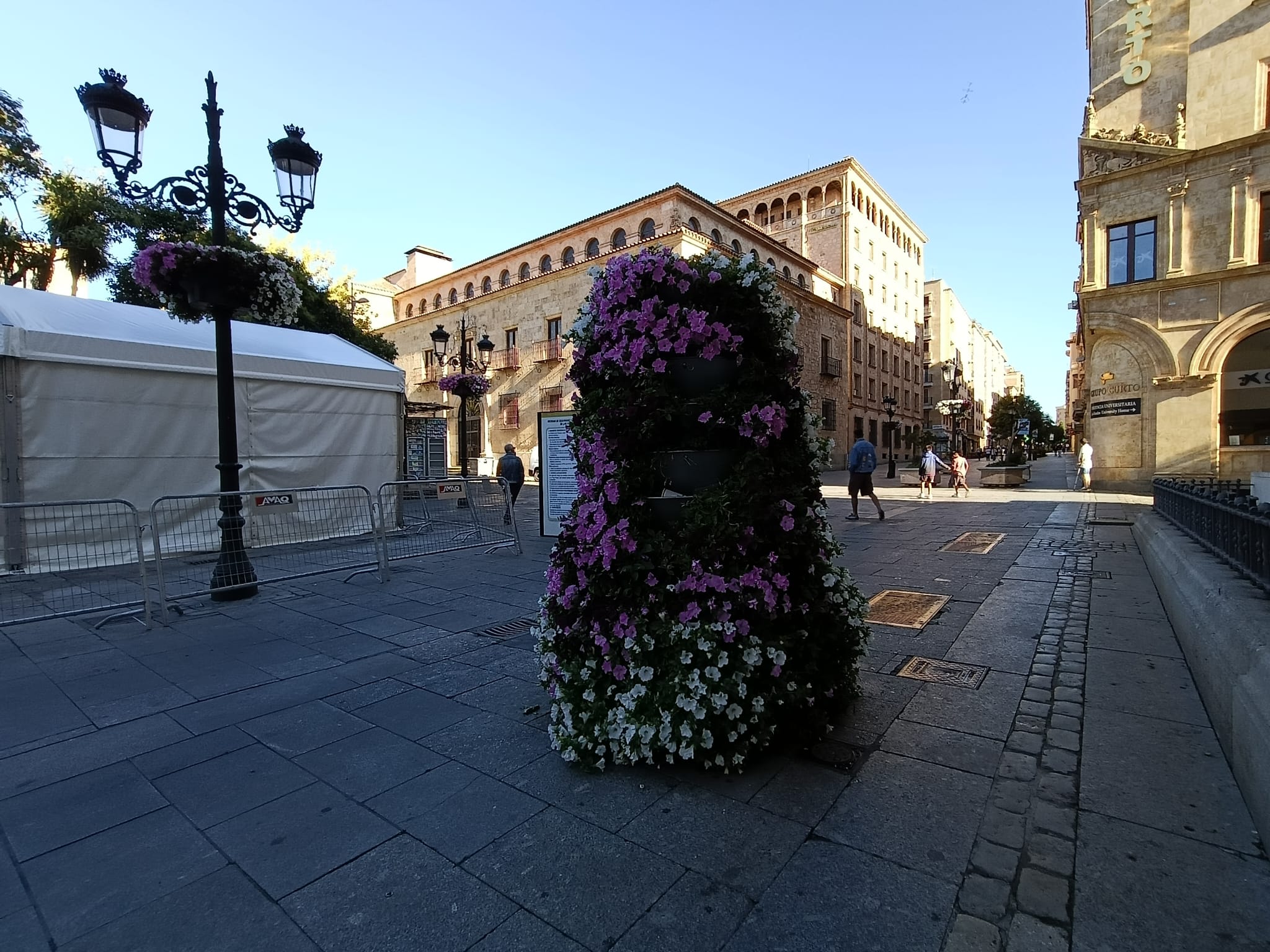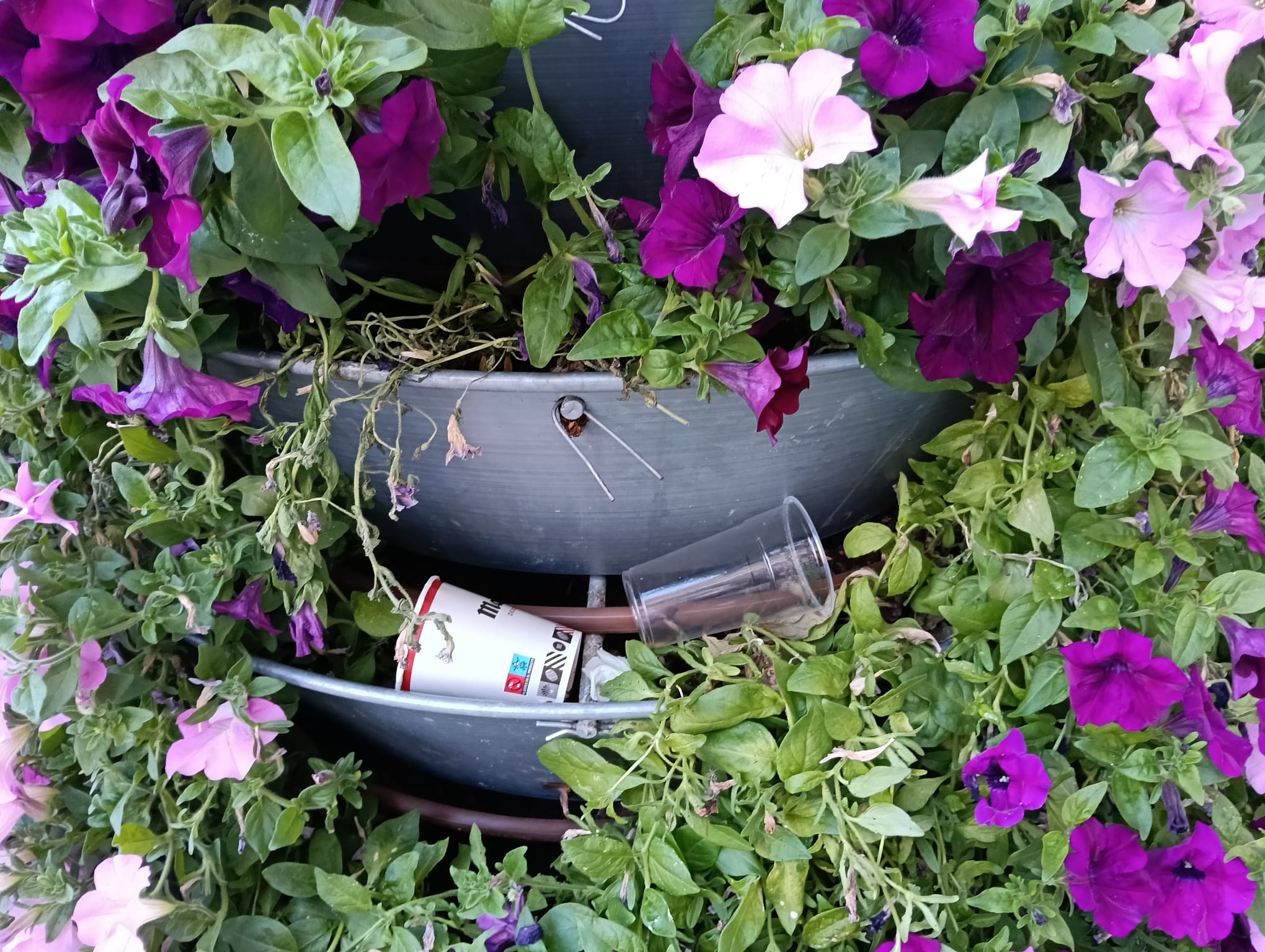 Las jardineras de la plaza de los Bandos amanecieron este domingo con vasos de plástico -cual abono para las petunias-.