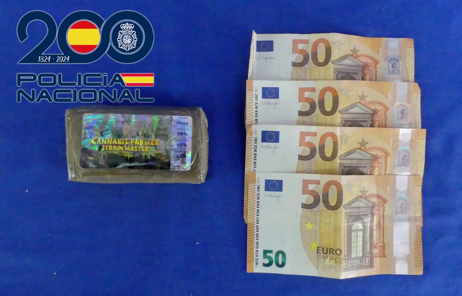 Localizan en el interior del bolso una pastilla de una sustancia vegetal de color marrón prensada, la cual tiene una apariencia similar al hachís. Estaba envuelta en un plástico transparente y con una etiqueta plateada en uno de los lados con una inscripción, comprobando que tiene una peso de 100,952 gramos. También comprueban que hay un total de 200 euros en cuatro billetes de 50 euros.