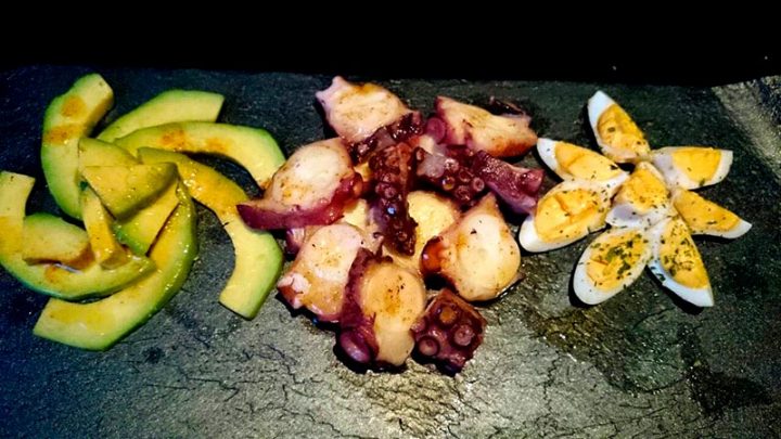 Una: Disponer en fuentes individuales y por separado el aguacate, en el centro el pulpo y los huevos cortado en cuatro mitades, todo ello regado con el aceite de pimentón y la pizca de perejil sólo en los huevos.