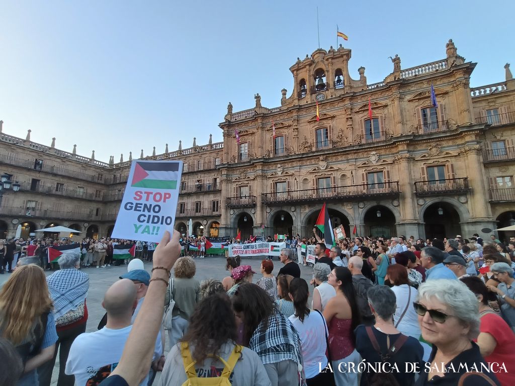 La Plaza Mayor de Salamanca albergó este jueves una nueva muestra de apoyo a Palestina, la mayor de las celebradas hasta ahora en la ciudad de Tormes, en esta ocasión para respaldar específicamente a la concentramos en apoyo a la Global Sumud Flotilla, conocida como flotilla hacia Gaza, que pretende romper el bloqueo israelí a la provincia palestina.
