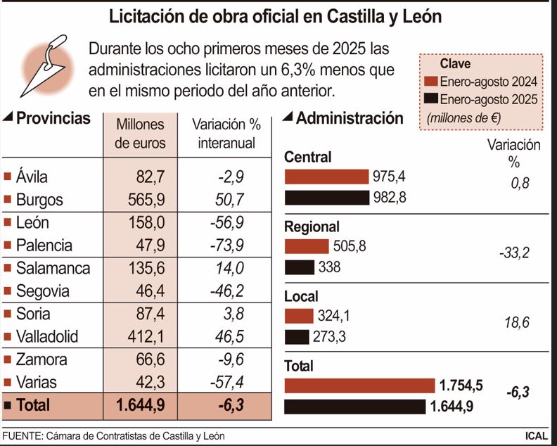 J.A. / ICAL. Las cifras recopiladas por la Cámara de Contratistas de Castilla y León, consultadas por Ical, apuntan a un 2025 similar al anterior para las constructoras, con una “lluvia” de contratos en los últimos meses superior a lo habitual. Con ello mejorará la licitación de obras, que se ha quedado rezagada en un ejercicio marcado por un mayor crecimiento económico de lo esperado y, por tanto, un aumento de los ingresos, lo que da margen a las administraciones para elevar el gasto.