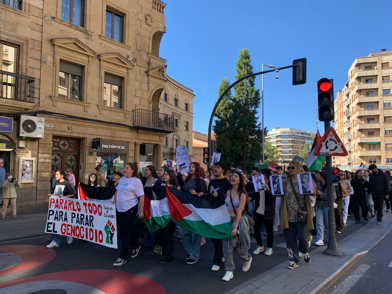 Alumnos universitarios y de secundaria acudieron a la jornada de huelga estudiantil para protestar contra el genocidio que se está cometiendo en Gaza por parte del gobierno israelita. El punto de concentración fue en la plaza de Los Bandos y desde allí recorrieron la calle Zamora, avenida de Mirat, Gran Vía y el final de la manifestación fue en la Subdelegación del Gobierno.