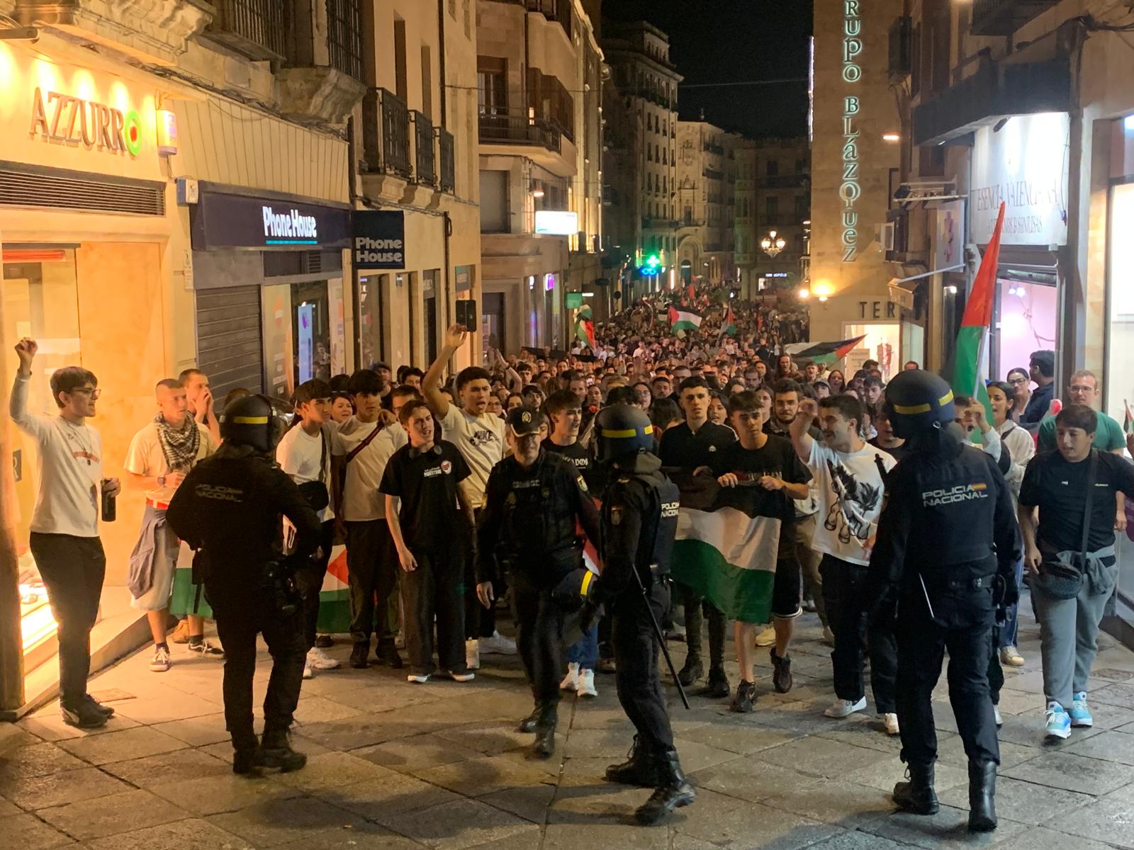 Sobre las 21.40 horas la manifestación decidió enfilar la calle Toro. Los policías se movieron los fueron escoltando a buen ritmo hasta la Plaza Mayor. Allí la manifestación bordeó los bancos e hizo un anillo, que se concentró en el centro donde se hizo un solo grito: Salamanca está con palestina.