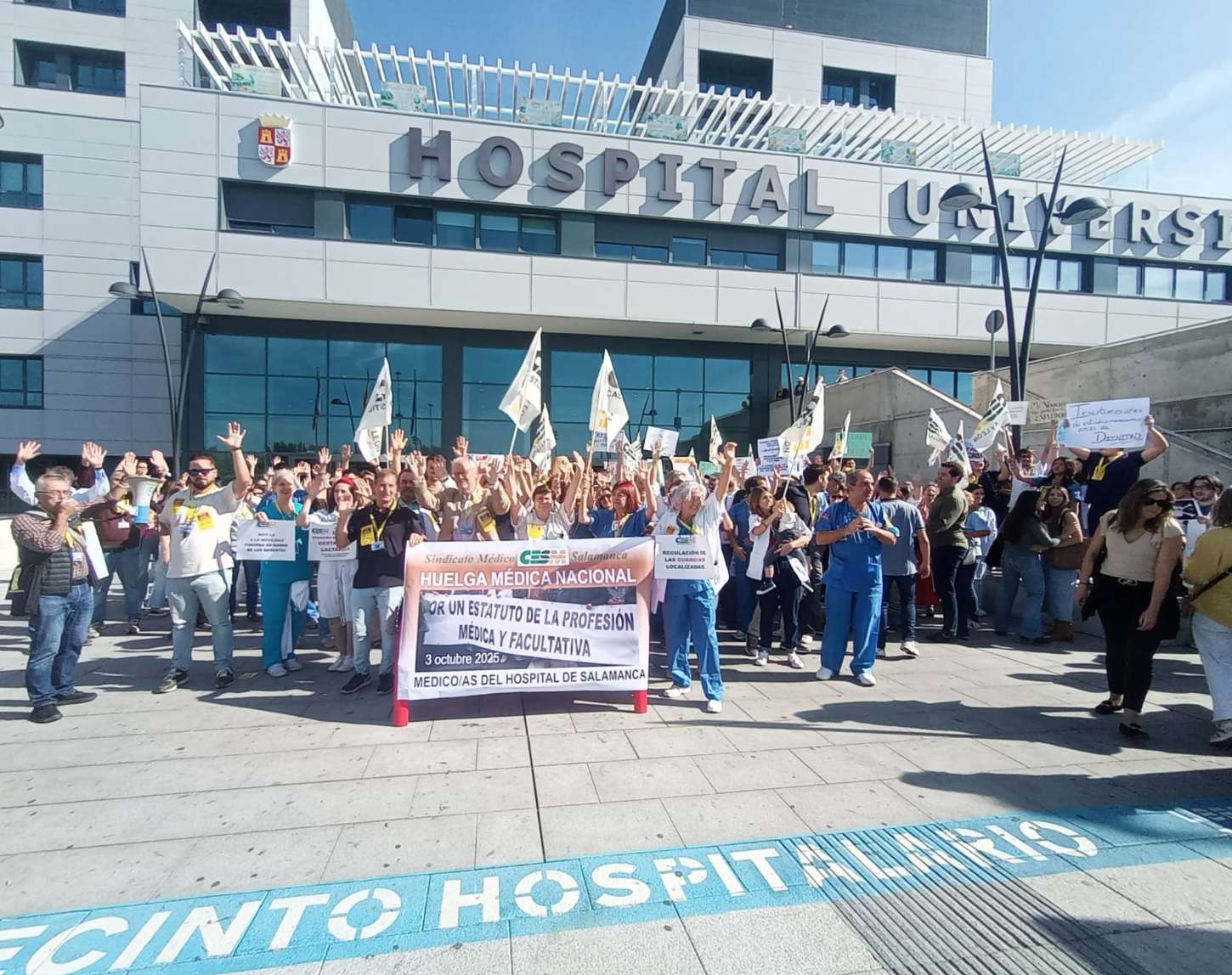 Los médicos y facultativos de Salamanca se han unido a la huelga convocada este viernes en todo el país para pedir un estatuto marco propio que regule su profesión e incluya sus reivindicaciones. Para secundar la convocatoria, decenas de profesionales sanitarios han realizado una concentración a las puertas del Complejo Asistencial de Salamanca (Causa) a las 12:00 horas, donde han coreado lemas como “Manos arriba, este estatuto es un atraco”, “Horas cotizadas horas trabajadas”, “No a la movilidad forzosa en manos de los gerentes”, “Exención de guardias en gestación y lactancia”, y otros como “Mónica, ladrona, cotízanos las horas” o “Estamos aquí para hacerte dimitir”, dirigidos a la ministra de Sanidad, Mónica García.