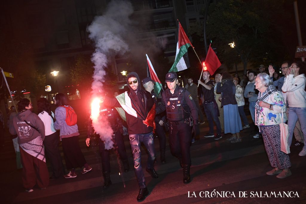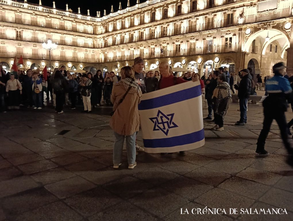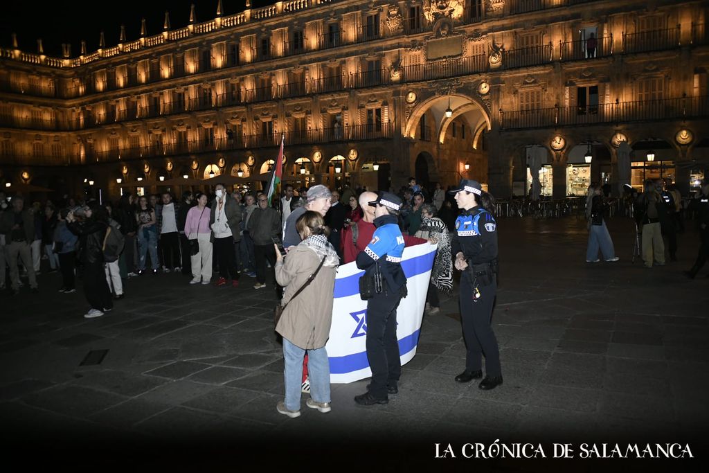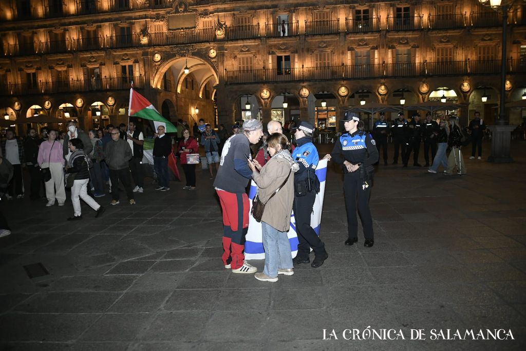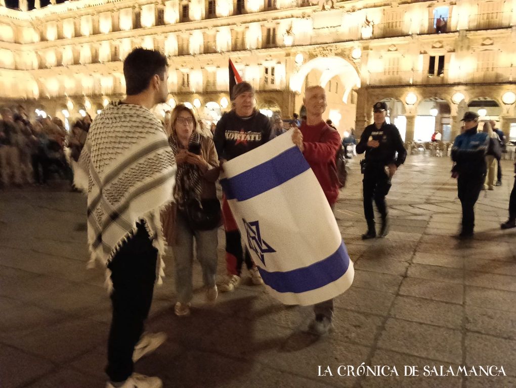 Agentes de la Policía Nacional y Local identificaron y se llevaron de la Plaza Mayor a dos manifestantes que intentaron quemar una bandera de Israel con la esvástica grabada en el centro de la estrella.
