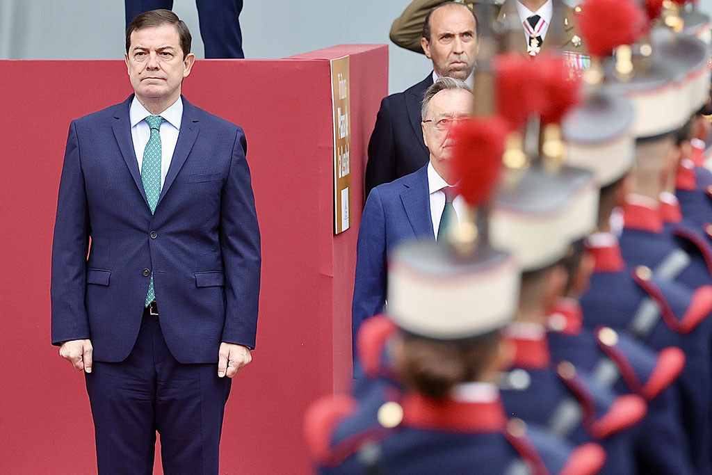 La Comunidad Autónoma de Castilla y León arropó este domingo con la presencia de sus máximas autoridades, los presidentes de la Junta y de las Cortes regionales, Alfonso Fernández Mañueco y Carlos Pollán, respectivamente, los actos de homenaje a la bandera nacional y al desfile militar con ocasión del día de la Fiesta Nacional en la capital de España.