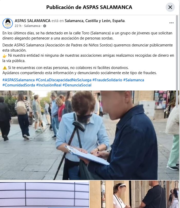 La asociación Aspas Salamanca -Asociación de Padres de Niños Sordos- denuncia que en los últimos días, ha detectado en la calle Toro a un grupo de jóvenes que solicitan dinero alegando pertenecer a una asociación de personas sordas.