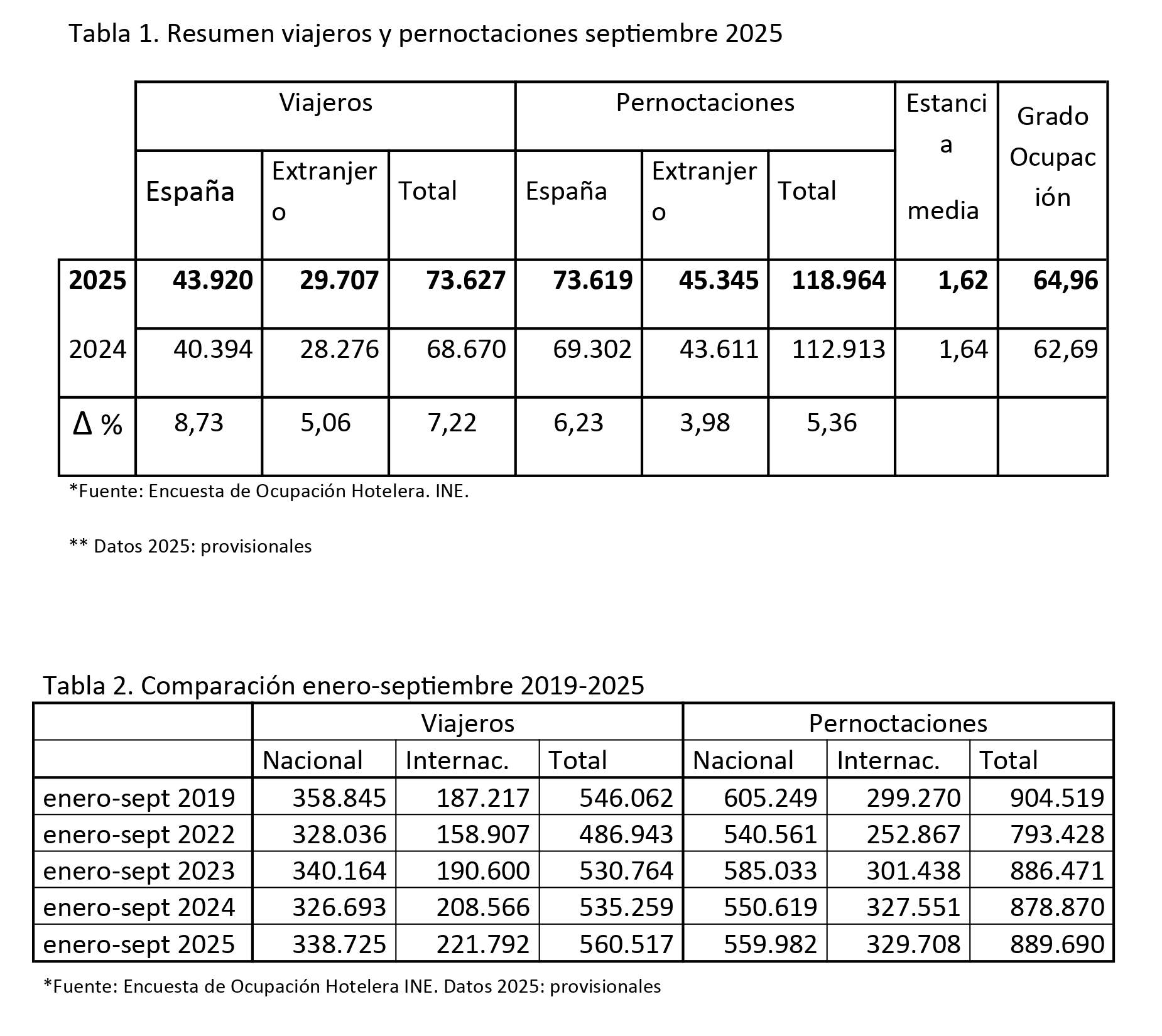 De nuevo septiembre acumula el récord en pernoctaciones de viajeros internacionales, mientras que respecto a las globales y nacionales, es el segundo mes en el histórico, solo por detrás del récord marcado por 2023.