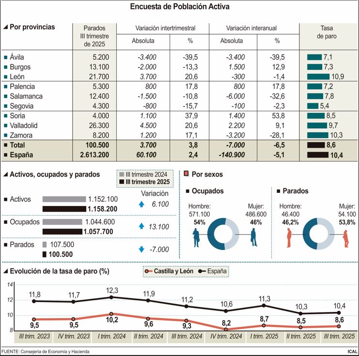 Castilla y León registró en el tercer trimestre del año una importante caída del número de desempleados, del 6,6 por ciento, con 7.000 parados menos en comparación con el mismo periodo de 2024, lo que deja la cifra total en 100.500 personas. Esta reducción contrasta con la rebaja nacional, ligeramente menos pronunciada, que fue del 5,1 por ciento, con 140.000 personas menos, hasta los 2,61 millones de parados, según los datos de la Encuesta de Población Activa (EPA).