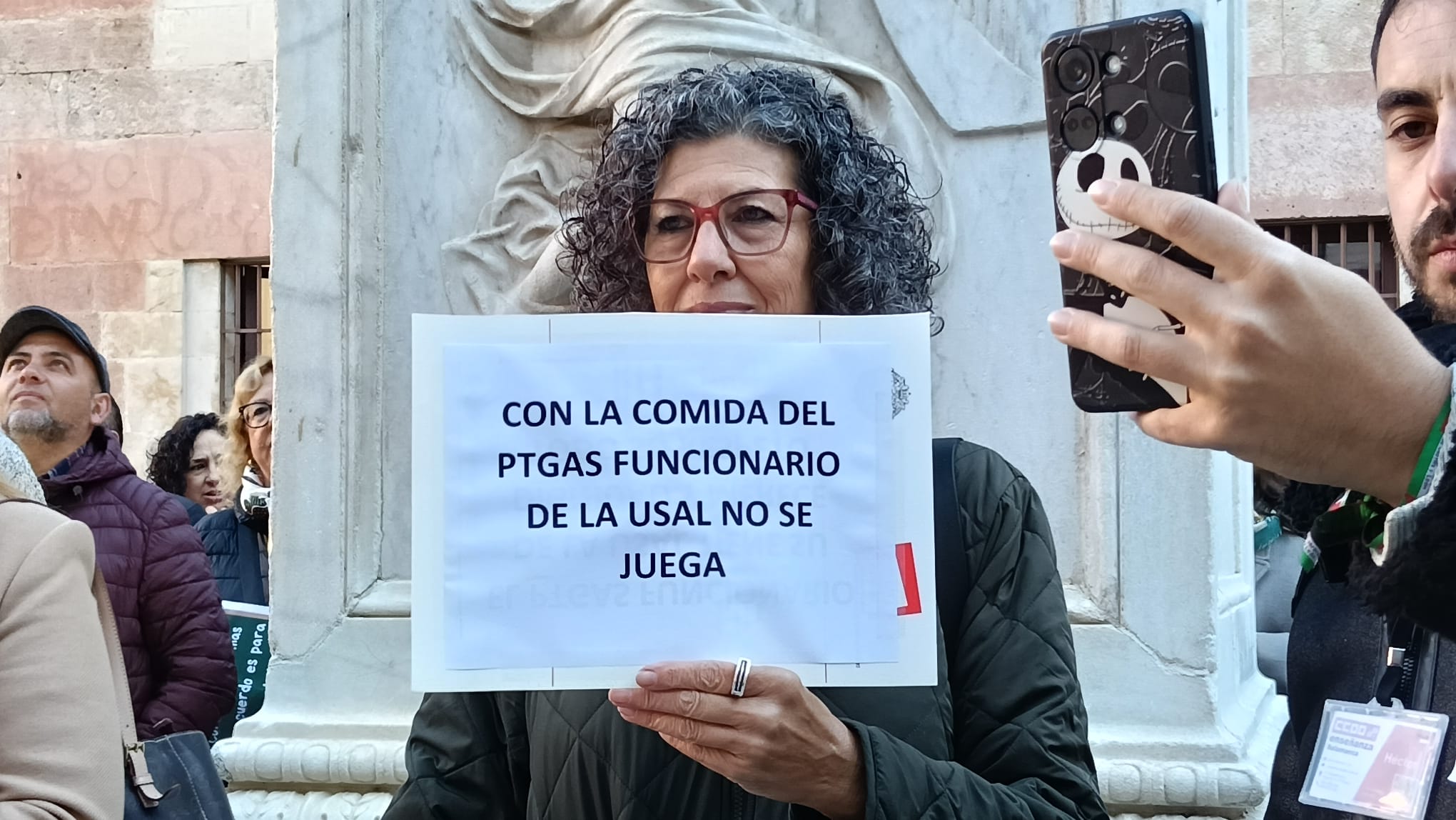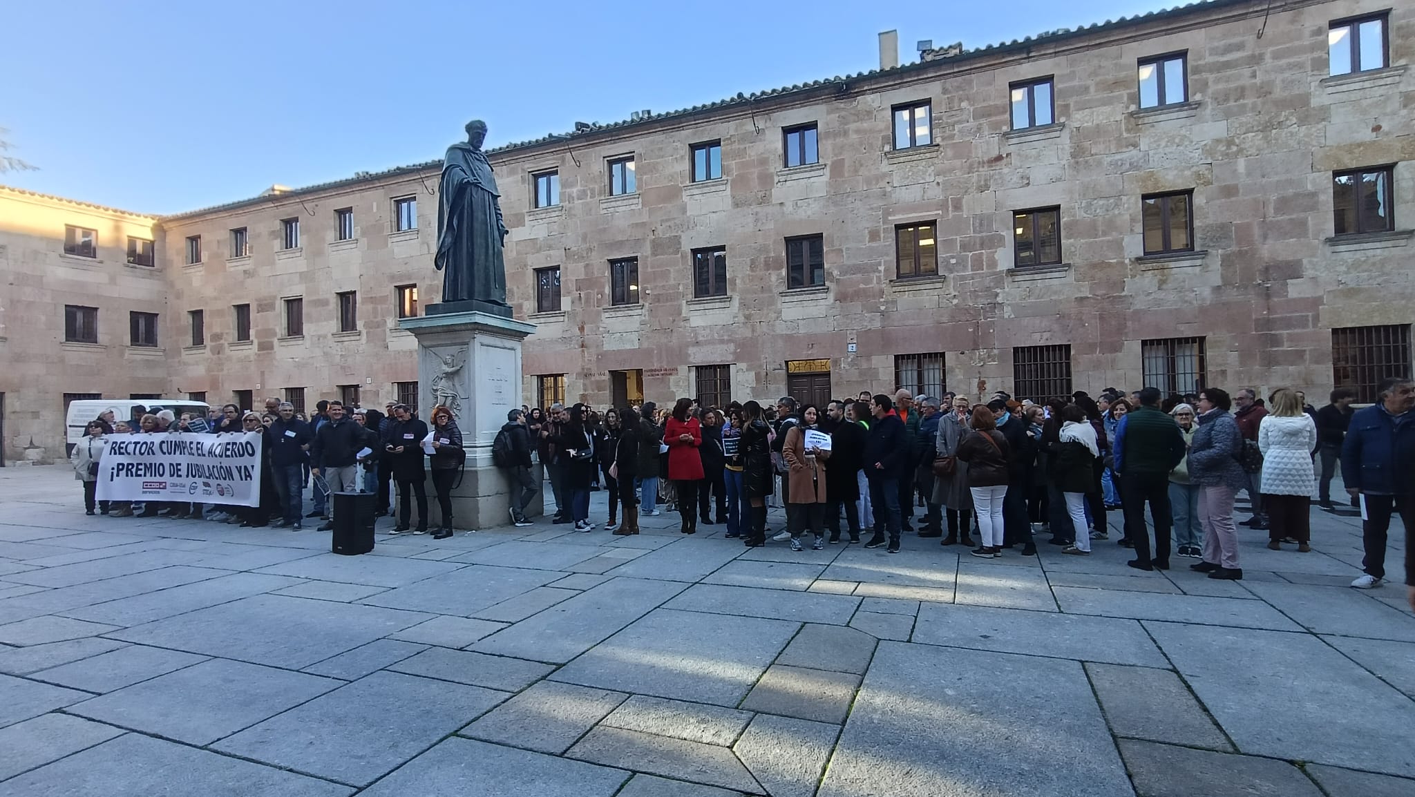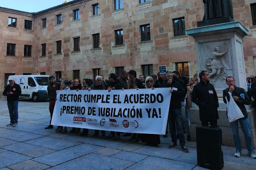 Detrás de la pancarta Rector cumple el acuerdo ¡Premio de jubilación ya! y con una gran pitada se han concentrado los sindicatos en el Patio de Escuelas para exigir la aprobación en Consejo de Gobierno del reglamento de aplicación de los premios de jubilación para el PTGAS funcionario en los términos acordados en la mesa de negociación de la Universidad celebrada el 22 de julio.