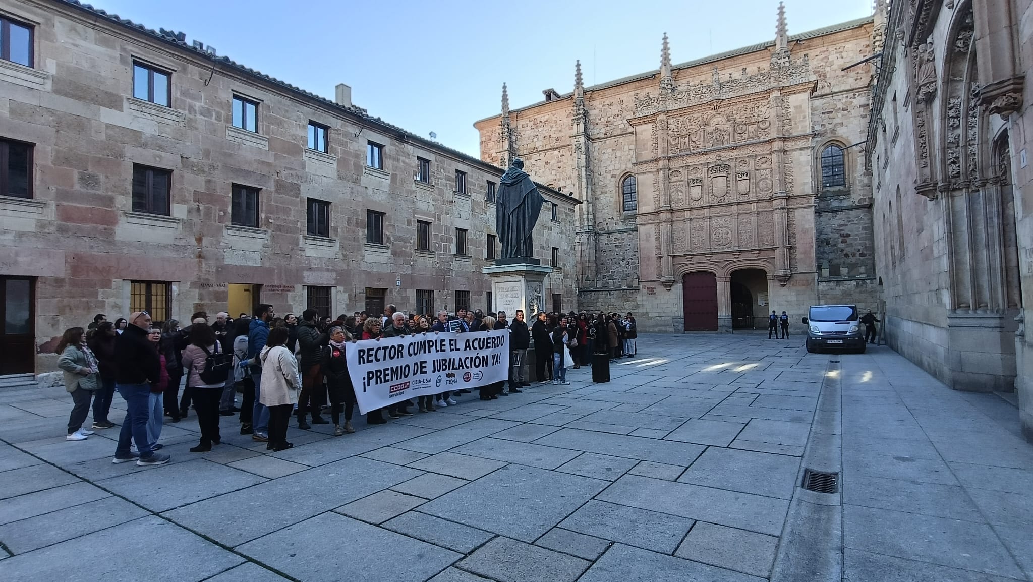 Detrás de la pancarta Rector cumple el acuerdo ¡Premio de jubilación ya! y con una gran pitada se han concentrado los sindicatos en el Patio de Escuelas para exigir la aprobación en Consejo de Gobierno del reglamento de aplicación de los premios de jubilación para el PTGAS funcionario en los términos acordados en la mesa de negociación de la Universidad celebrada el 22 de julio.