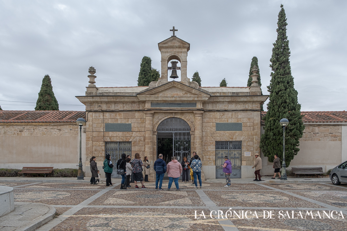 La visita que proponen desde Salamanca de Muerte comienza en la misma puerta del cementerio, donde explican que comenzó a ‘acoger’ a nuestros muertos en 1832. Es un proyecto del arquitecto Tomás Francisco Cafranga y más adelante, a partir de 1867, el arquitecto José Secall y Asión realizó una mejora de la fachada y una serie de ampliaciones del terreno.