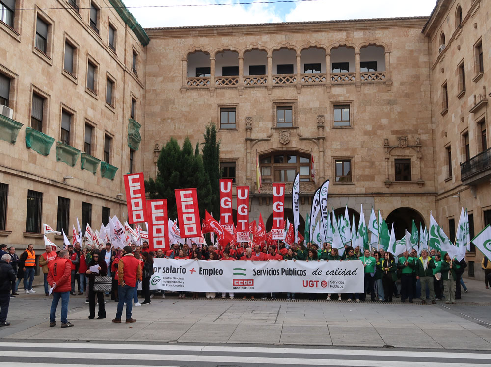 Pitidos y silbidos al ministro Óscar López en Salamanca por parte de los sindicatos UGT Servicios Públicos, el Área Pública de CCOO y CSIF. Miembros de los tres sindicatos se concentraron en la plaza de la Constitución salmantina, haciendo fuerza desde la capital charra, al igual que otros compañeros lo hicieron en Madrid frente al Ministerio para la Transformación Digital y de la Función Pública, reclamando unos servicios públicos de calidad, incrementos salariales, más empleo y mejora de las condiciones laborales para más de tres millones y medio de empleadas y empleados públicos.