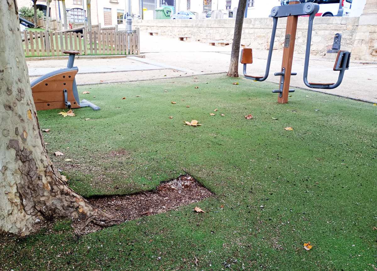 Hay, además, plantas secas, y otros desperfectos de que los que el Ayuntamiento de la ciudad sigue sin hacerse cargo, como la falta de una porción de césped artificial en la zona de aparatos biosaludables o las pintadas en la cubierta de la luz que ilumina la estatua de Cristóbal Colón, inaugurada el 9 de septiembre de 1893 y creada el escultor zamorano Eduardo Barrón.