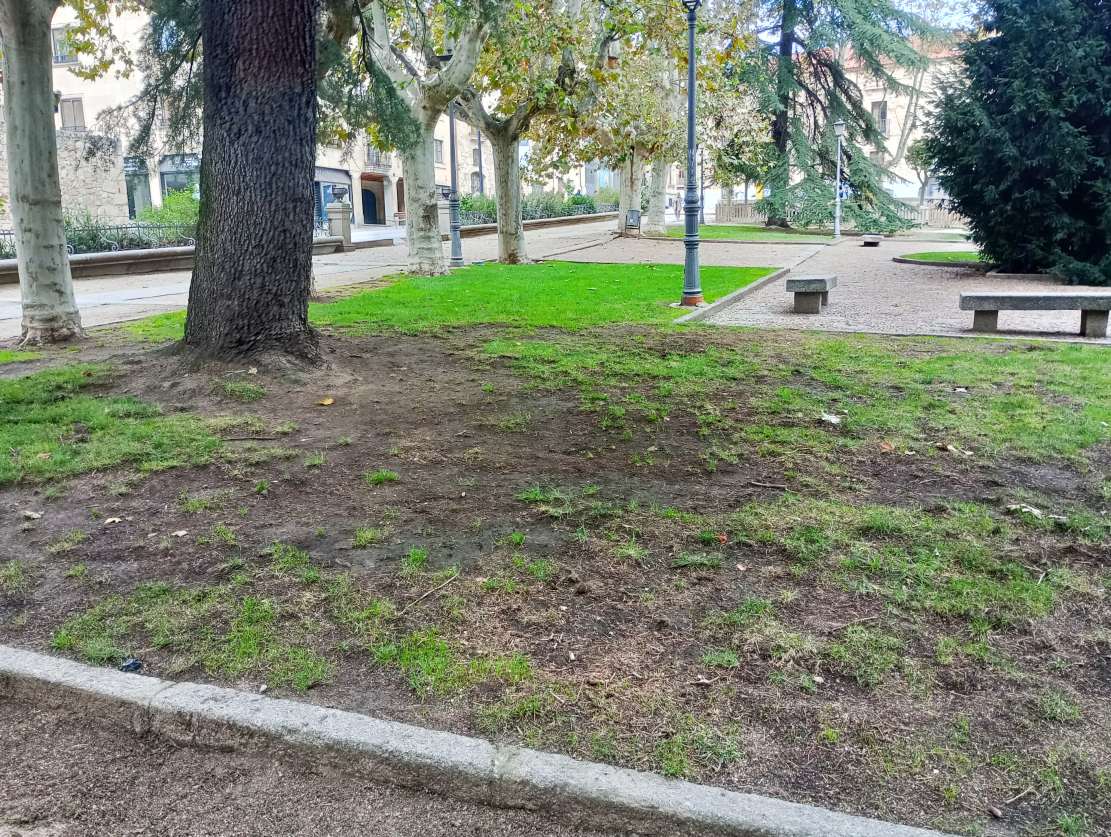 A ello se suma el mal estado del césped, con varias zonas ‘peladas’, y la enorme cantidad de deyecciones de pájaros que cubren con múltiples manchas blancas gran parte de la vegetación.