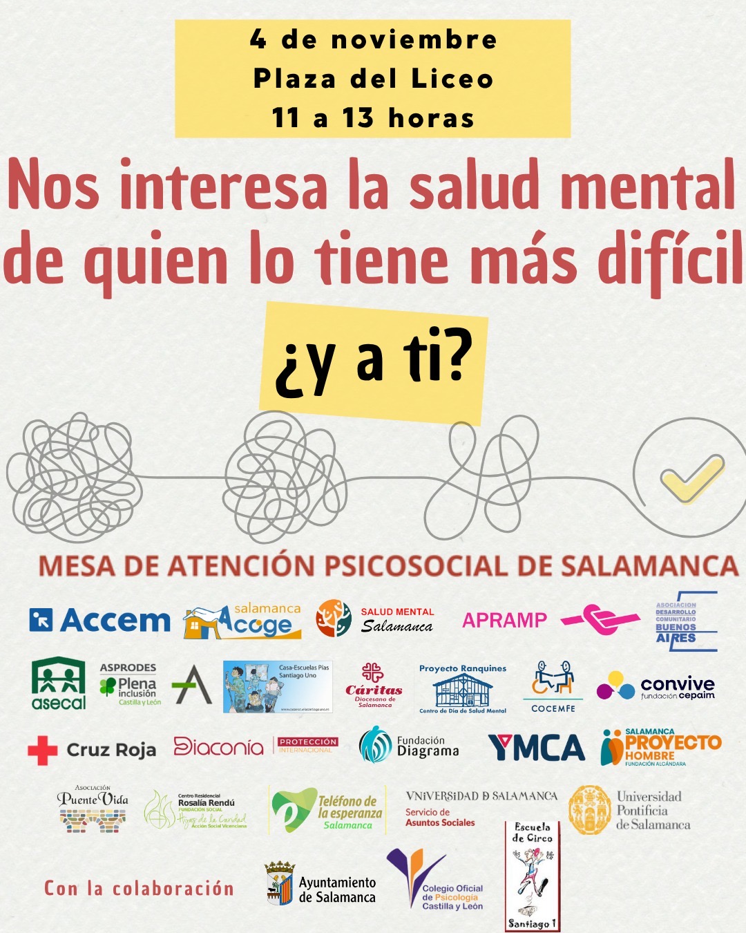La Mesa de Atención Psicosocial de Salamanca invita a la ciudadanía a participar en un acto por la salud mental y la inclusión social este 4 de noviembre de 11.00 a 13.00 horas en Plaza del Liceo de Salamanca.