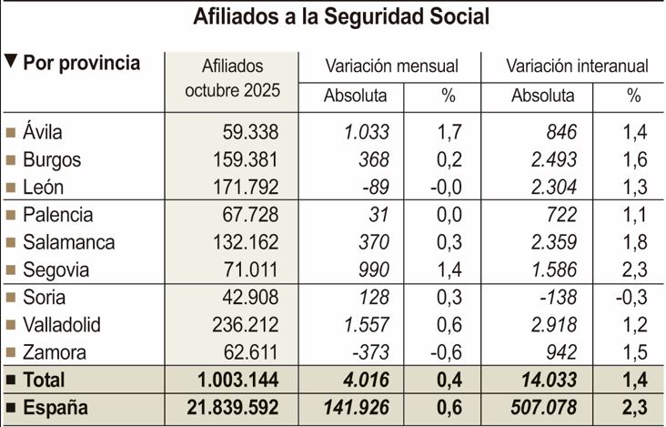 El número de afiliados a la Seguridad Social aumentó un 0,40 por ciento en Castilla y León en el mes de octubre, con 4.016 personas inscritas más que en septiembre, por lo que la Comunidad vuelve a superar el millón de cotizantes, hasta los 1.003.144.