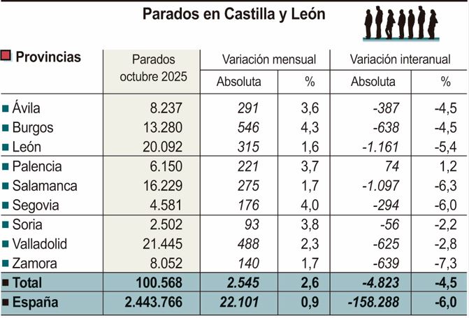 El número de desempleados se elevó en octubre en Castilla y León en 2.545 personas, lo que supone un incremento del 2,6 por ciento sobre el mes de septiembre, hasta un total de 100.568 parados, y la mayor subida entre las autonomías.