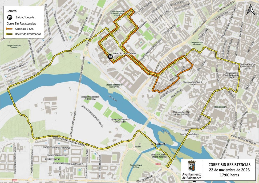 Ambas pruebas partirán desde la Facultad de Farmacia de la Universidad de Salamanca (Usal) y, a partir de las 17:00 horas, afectarán al paseo de la Universidad de Coimbra, calle Donantes de Sangre, calle Alfonso X el Sabio, paseo Francisco Tomás y Valiente, avenida del Doctor Ramos del Manzano, calle de José Lamano Beneite, avenida Padre Ignacio Ellacuría, paseos de San Gregorio y del Rector Esperabé, calle Tentenecio, plaza Juan XXIII, calle Tavira, calle Libreros, plaza de San Isidro, Rúa Antigua, Rúa Mayor, calle Jesús, calle Pan y Carbón, calle San Pablo, plaza del Poeta Iglesias, Plaza Mayor, calle Prior, calle Bordadores, calle Úrsulas, calle Domínguez Berrueta, calle Ramón y Cajal, calle Fonseca, calle García Tejado, calle Portillo de San Vicente, calle Donantes de Sangre, avenida del Doctor Gregorio Marañón, paseo del Francisco Tomás y Valiente, plaza de Diego de Covarrubias, paseo de la Universidad de Coimbra y calle Licenciado Méndez Nieto.