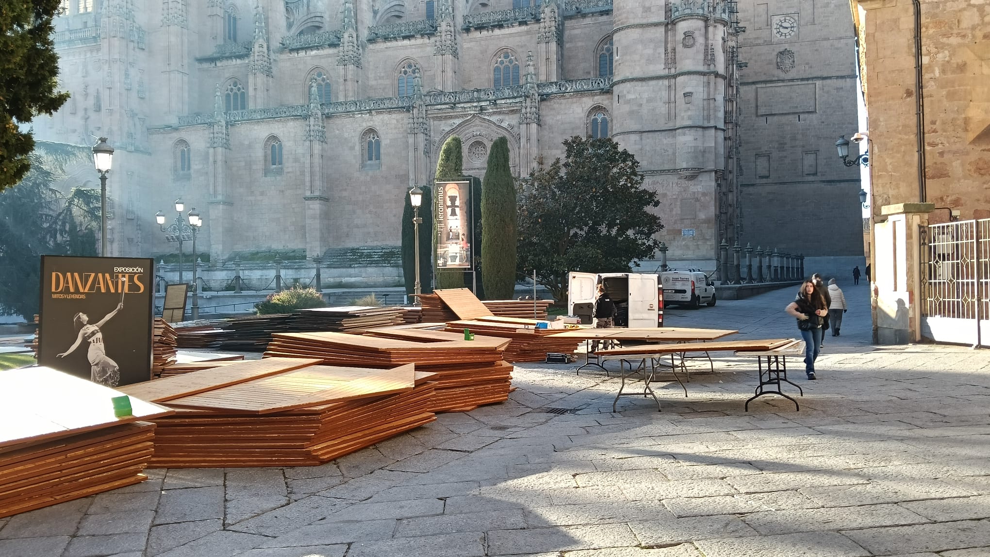 La plaza de Anaya se ha visto ‘invadida¡ este sábado por tablones. Son los que servirán para el montaje de los puestos del Mercado de Navidad.
