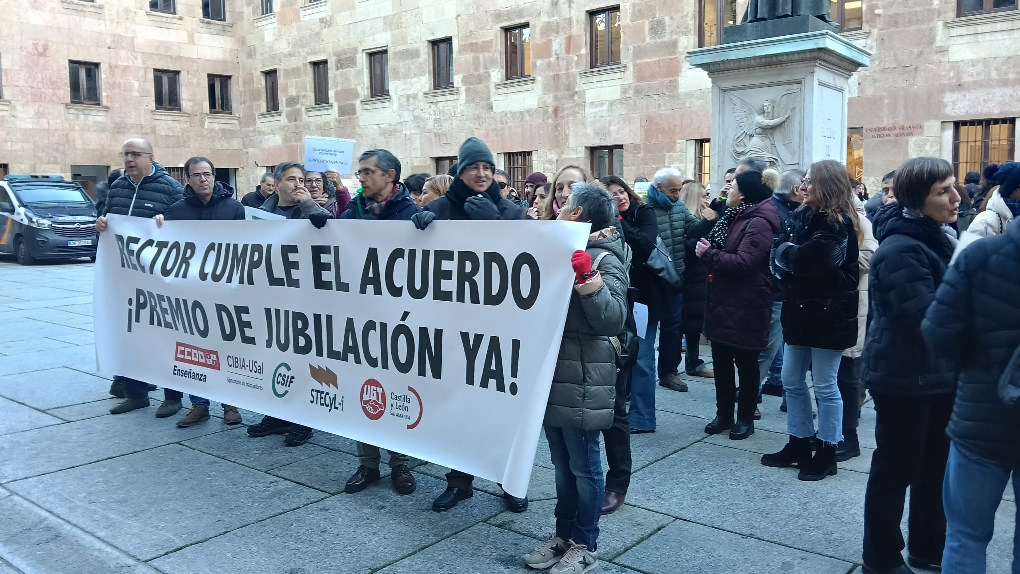 Justo un mes después de la primera pitada, se han vuelto a concentrar los sindicatos en el Patio de Escuelas parapetados por la pancarta Rector cumple el acuerdo ¡Premio de jubilación ya!