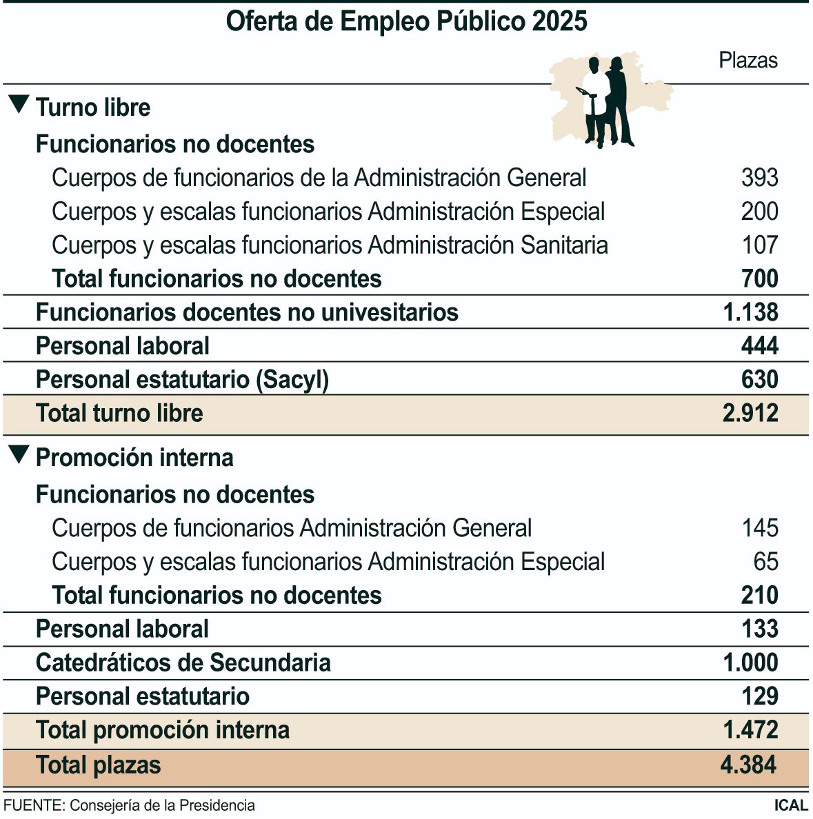 La Consejería de la Presidencia publicó este lunes, en el Boletín Oficial de Castilla y León (Bocyl), la Oferta de Empleo Público (Opep) para el año 2025 que incluye 2.962 puestos del turno libre y 1.472 de promoción interna.