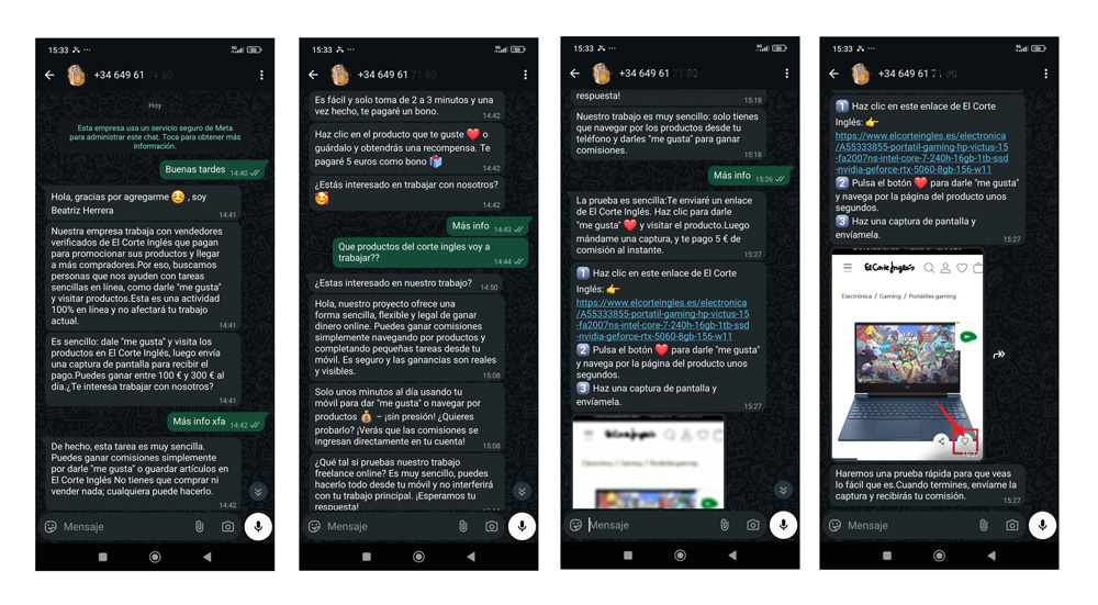 La primera operación que realizan es contactar con una persona y una vez que se han saludado explican en qué consiste el trabajo. “Nuestra empresa trabaja con vendedores verificados por El Corte Inglés que pagan para promocionar sus productos y llegar a más compradores. Por eso, buscamos personas que nos ayuden con tareas sencillas en línea, como darle ‘me gusta’ y visitar productos. Esta es una actividad 100% en línea y no afectará a tu trabajo actual”.