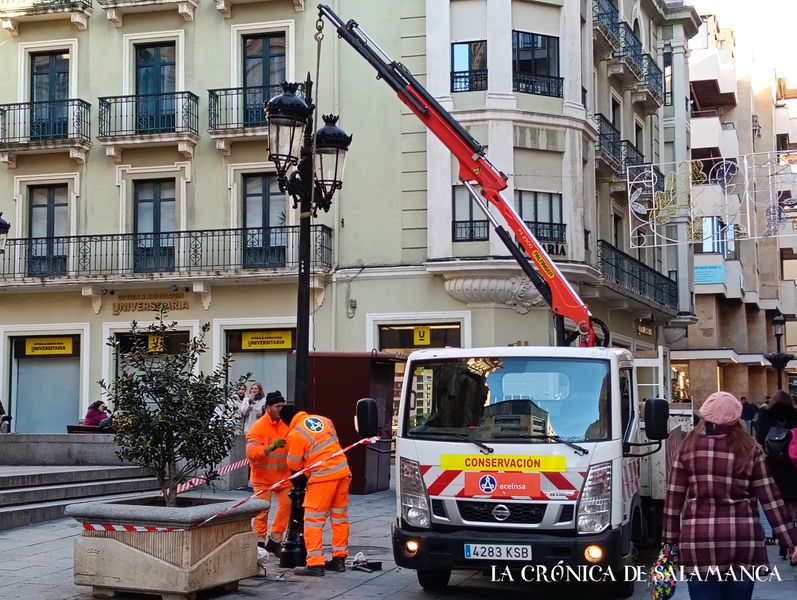 Los empelados de Aceinsa, la empresa privada que explota las señales viarias y la iluminación pública de Salamanca, se afanaban este martes por reponer una farola que pasó a mejor vida.