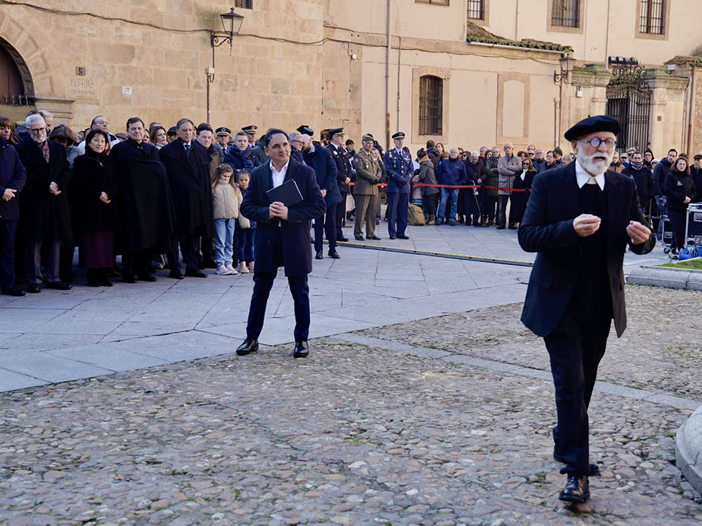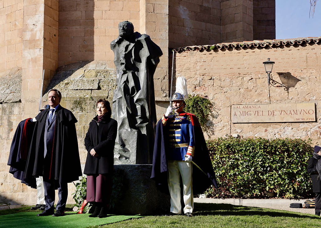 Acompañada por el alcalde, Carlos García Carbayo, la representante de la institución académica depositó la ofrenda a los pies de la estatua de Unamuno, obra de Pablo Serrano, situada junto a la casa en la que vivió y murió el célebre personaje en la calle Bordadores.