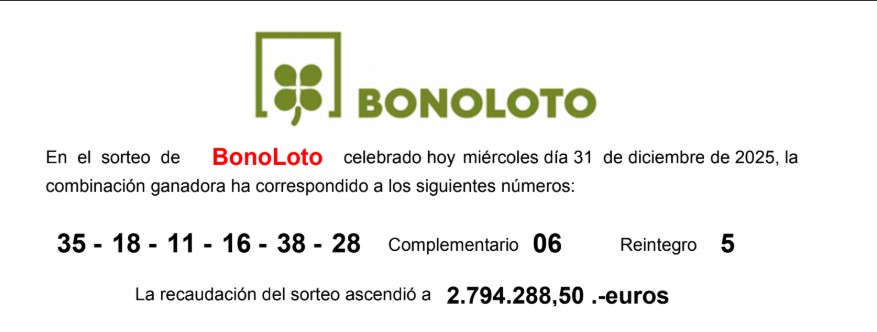 Esta es la combinación ganadora del sorteo de la Bonoloto celebrada este 31 de diciembre y junto al salmantino, hay otro acertante de segunda categoría (5 aciertos + Complementario) un vecino de Santa Coloma de Gramenet (Barcelona).