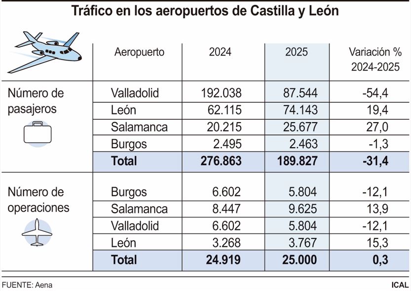 La cifra de pasajeros en los cuatro aeropuertos de Castilla y León se desplomó un 31,4 por ciento en 2025, con un total de 189.827 personas, casi 90.000 menos que el año anterior. Esta fuerte caída se sustenta en una disminución del 54,4 por ciento de los datos de Valladolid, que pierde 105.000 viajeros en un año, tras la salida de la compañía Ryanair del aeródromo de Villanubla antes del pasado verano, según los datos facilitados por Aena y constatados por la Agencia Ical.