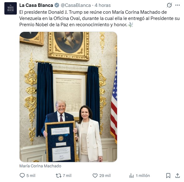 En un encuentro marcado por el simbolismo y las contradicciones políticas, el presidente Donald Trump recibió este jueves en la Casa Blanca a la líder opositora venezolana y premio Nobel de la Paz, María Corina Machado, que accedió y salió por la puerta de servicio. La reunión, un almuerzo privado de dos horas, dejó una imagen de alto impacto: Machado entregó su medalla del Nobel al mandatario estadounidense, un gesto que Trump calificó en sus redes sociales como un «honor» y una muestra de «respeto mutuo».