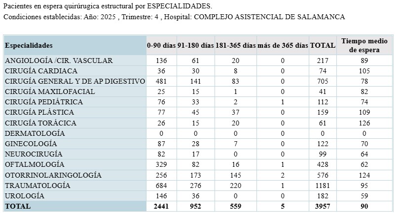 Salamanca contaba el pasado 31 de diciembre con 129 pacientes prioridad uno (cuyo tratamiento quirúrgico, siendo programable, no admite una demora superior a 30 días), con una demora media de 13 días para operarse. Son 44 pacientes más y una demora media 3 días inferior a la del mismo trimestre de 2024.
