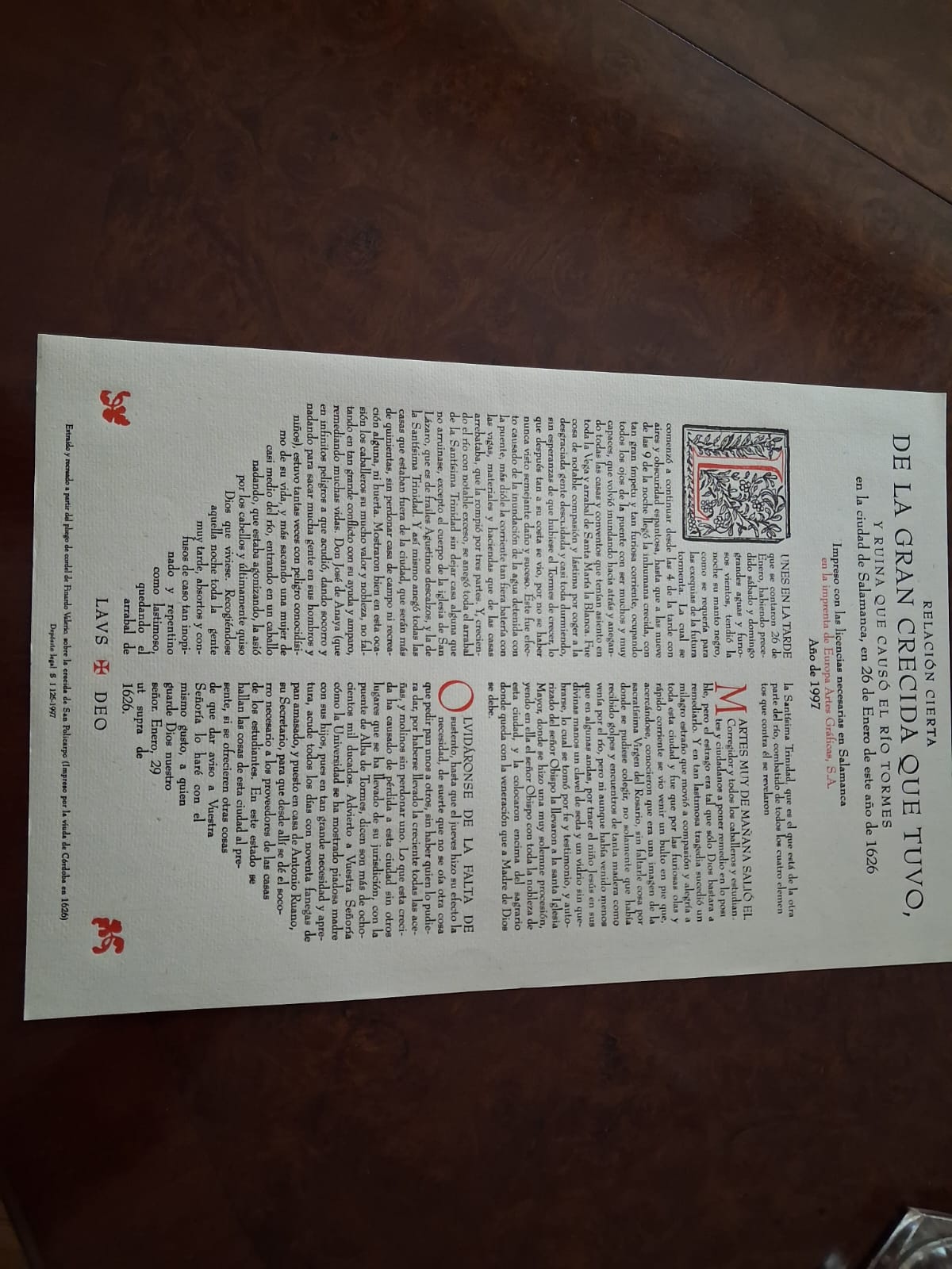 Ordenando papeles, Julián Lanzarote se encontró con documento extraído y recreado a partir del pliego del condel de Finardo Valerio, sobre la crecida de San Policarpo (impreso por la viuda de Córdoba en 1626) y que Europa Artes Gráficas regaló en 1997 por Navidad.