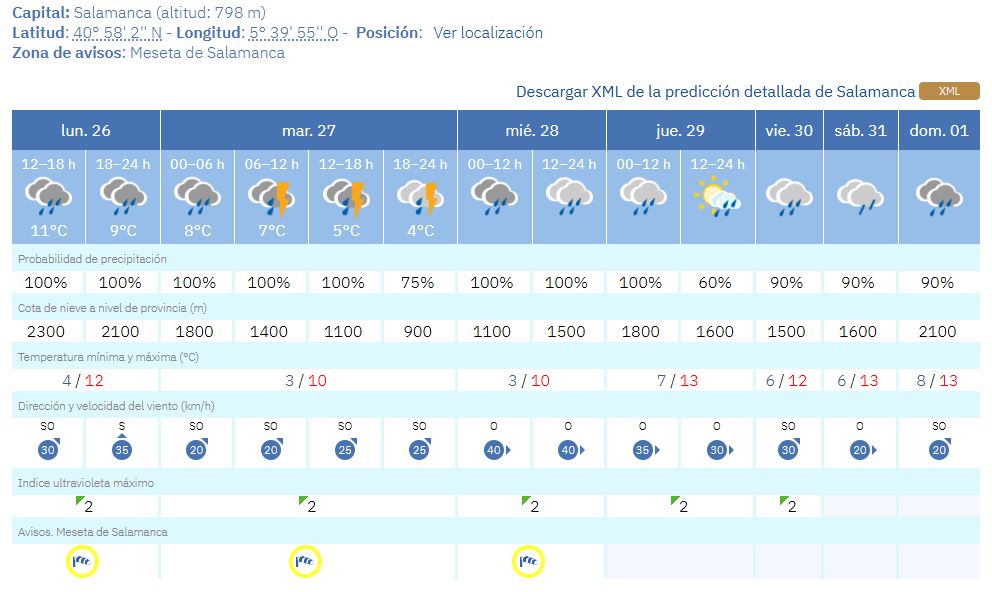 En Salamanca capital, por su parte, la Aemet solo prevé mucha agua y escasas posibilidades de nevadas, pero alerta de vientos fuertes durante tres adías, lo que motivará que la sensación térmica sea más fría de lo que marcarán los termómetros.